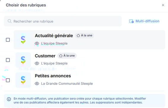 Jusqu’à présent, une publication ne pouvait être diffusée que dans une seule rubrique, obligeant les administrateurs à recréer plusieurs publications pour toucher différentes audiences. Cette évolution vise à simplifier la diffusion des contenus, gagner du temps dans la publication et améliorer la cohérence des communications.
